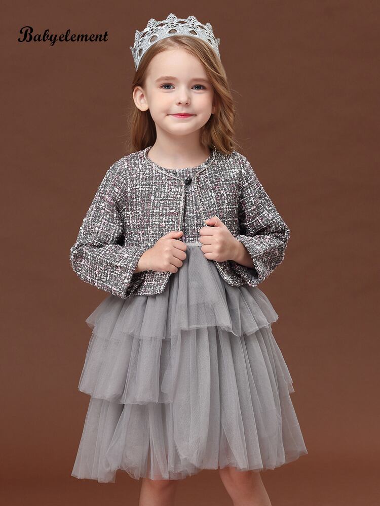 グレーツイードのジャケットとチュール付ワンピースのセットアップです。